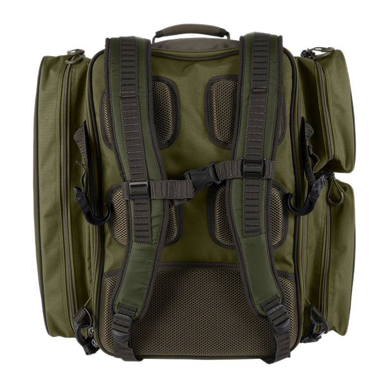 Högt huvudfack sväljer enkelt flera betesboxar, kläder och övriga nödvändigheter. Sidofacken är genomtänkt placerade och dimensionerade för sånt som behöver vara nära till hands – tafsmaterial, verktyg eller snacks. Längre remmar på ovansidan gör det smidigt att fästa håv eller banksticks utan krångel.