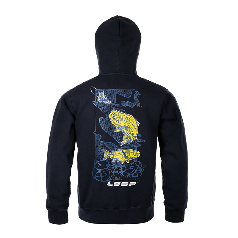Den här hoodien kombinerar laxpassion med vardagskomfort. Den borstade fleecen i 100 % ekologisk, GOTS-certifierad bomull känns varm och behaglig både under svala morgnar vid älven och på väg till jobbet. Den originella Atlantic Salmon-loggan av Vancouver-konstnären Eric Peake ger en tydlig nick till storlaxen utan att kännas skrikig.